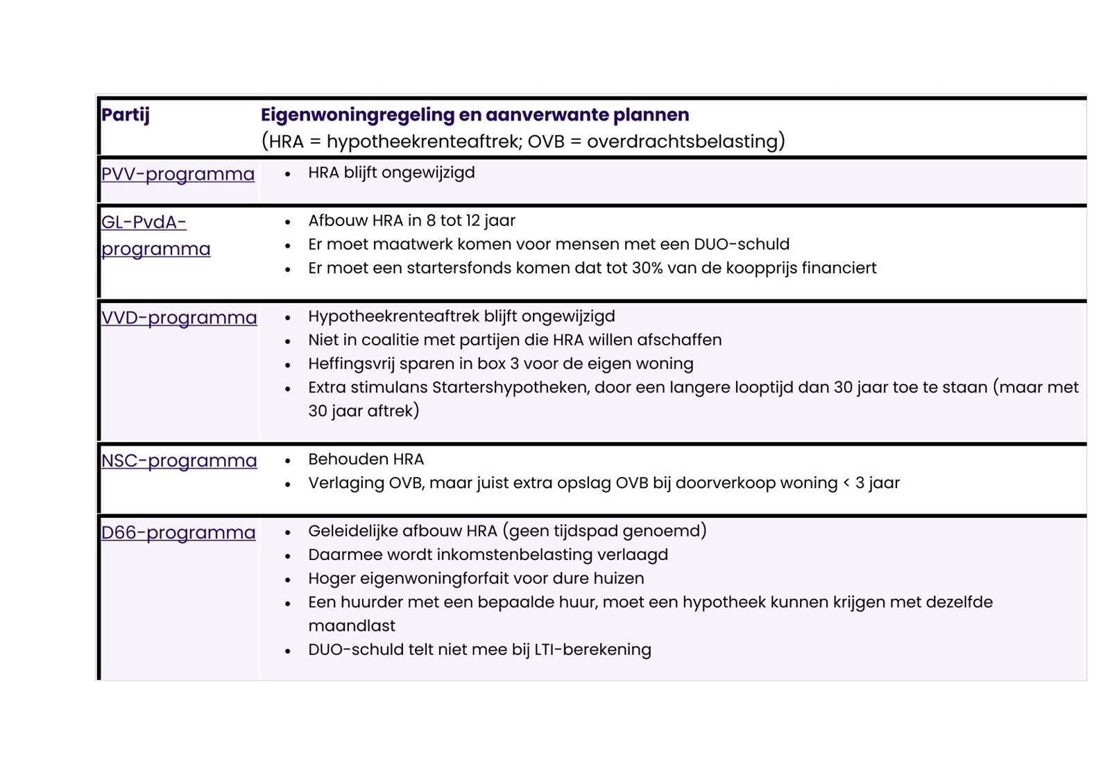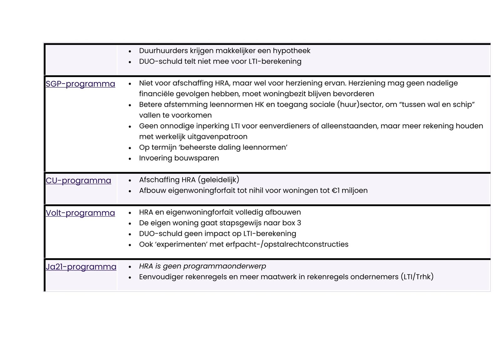 Wat extra interessant is, is om te kijken naar wat de partijen verder nog noemen in relatie tot woningfinanciering. Zo zijn er aardig wat partijen die DUO-leningen (studieschulden) in het geheel niet willen laten meetellen bij de berekening van de maximale leencapaciteit (LTI). Partijen hebben daarnaast regelmatig een standpunt over de overdrachtsbelasting (OVB) en het eigenwoningforfait.