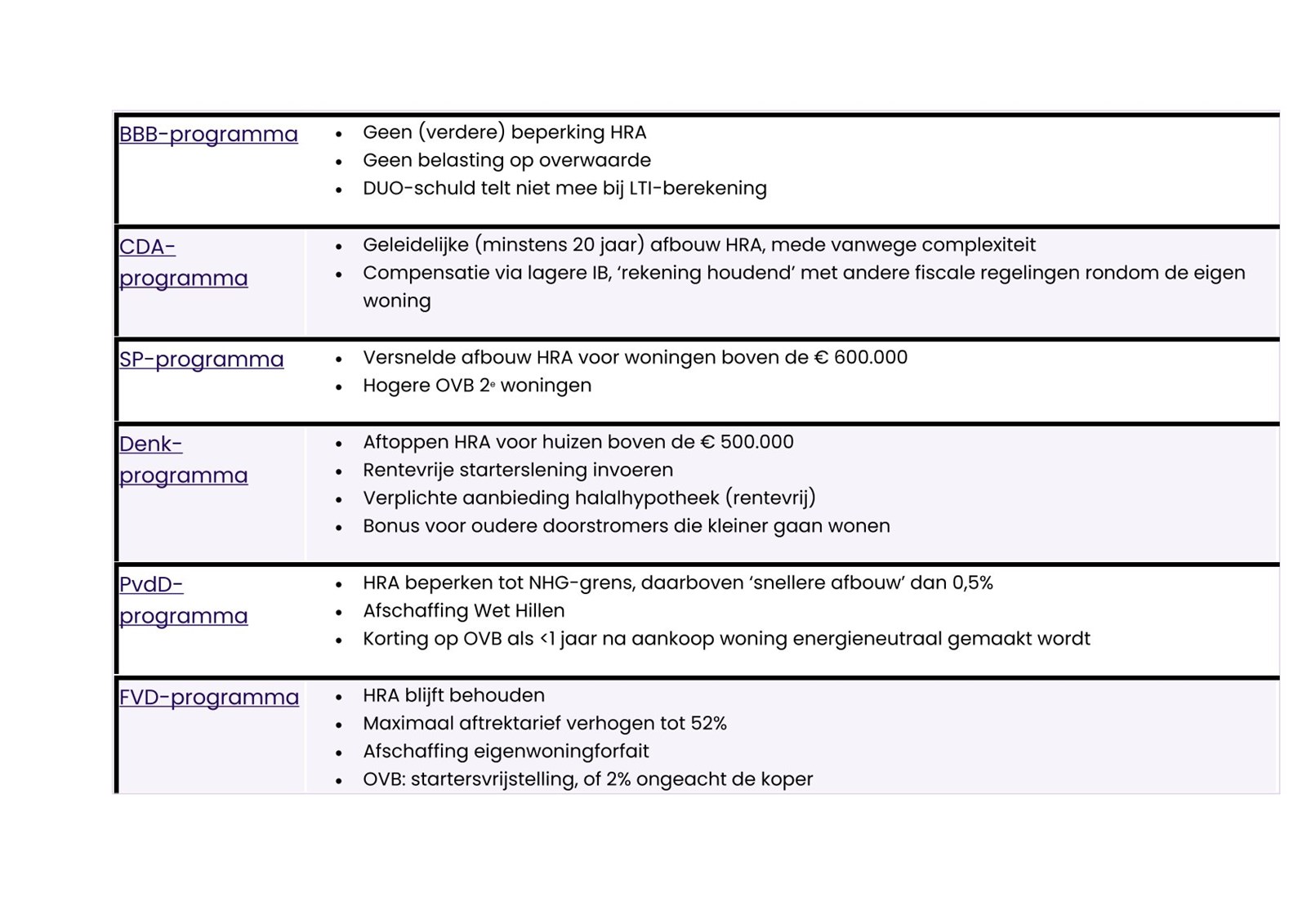 In alle verkiezingsprogramma’s (op één na) van de partijen die nu in de Tweede Kamer zitten, komt hypotheekrenteaftrek aan bod. Het is interessant te zien welke partij de hypotheekrenteaftrek (HRA) wil afschaffen en welke niet. Er zijn meer smaken: zo zijn er partijen die de hypotheekrenteaftrek alleen tot een bepaalde grens willen behouden. Er wordt dan gesproken over ‘boven een bepaalde woningwaarde’, waarbij het dus niet om de hoogte van de schuld lijkt te gaan. Ook is niet duidelijk of het om een grens of een drempel gaat. Er is zelfs een partij die nog denkt dat het aftrektarief jaarlijks met 0,5% wordt afgebouwd, en dat wil versnellen. Niet elke partij lijkt dus geheel op de hoogte van de huidige regels…